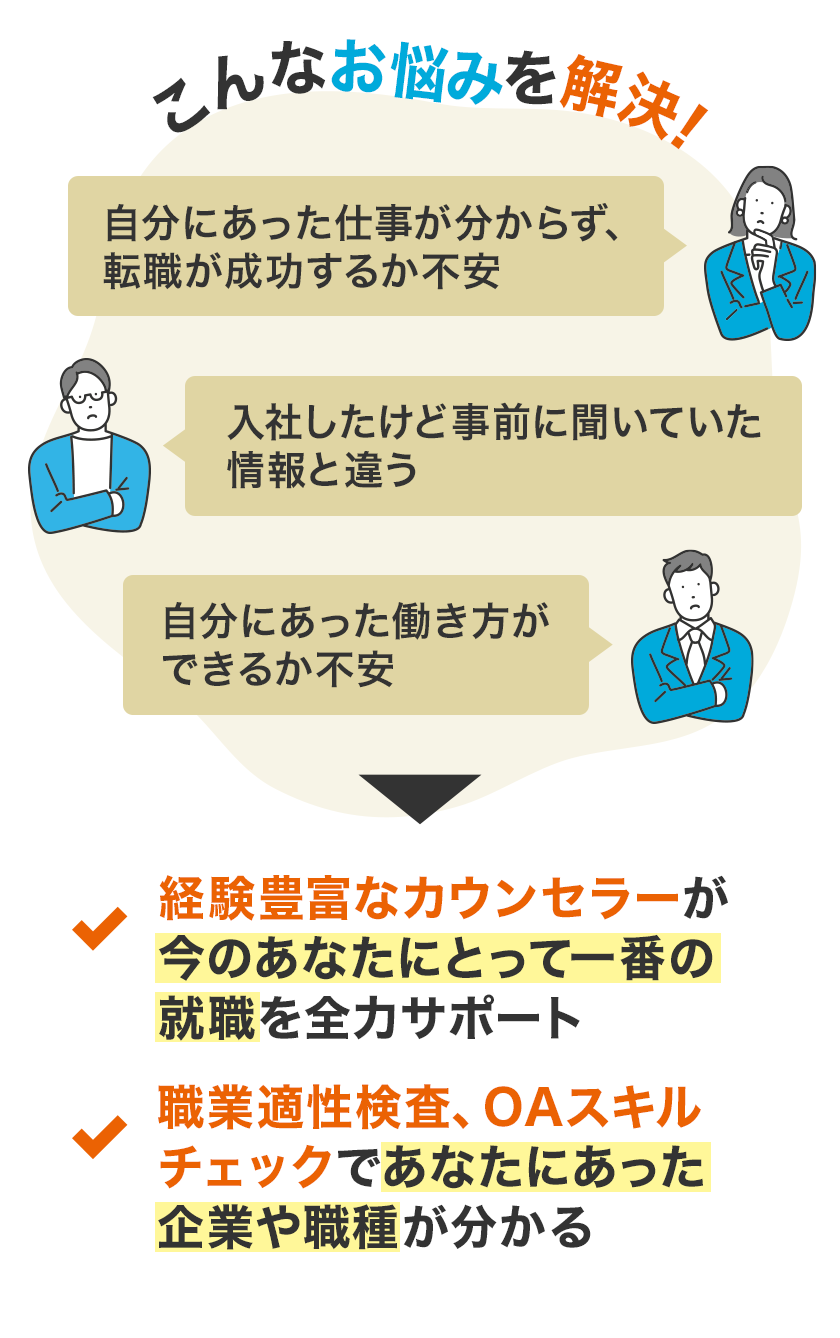 ![]() 経験豊富なカウンセラーが丁寧にお話を伺い、ご希望に合わせた最適な求人をご提案